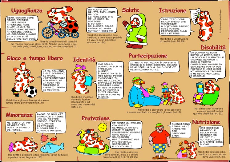 La Convenzione sui diritti dell'infanzia è stata scritta per gli avvocati, perciò nemmeno per gli adulti è facile e comprensibile. Abbiamo deciso di scegliere i diritti che ci sembrano più importanti e con l'aiuto di La Pimpa guidarti alla scoperta dei diritti delle bambine e dei bambini.